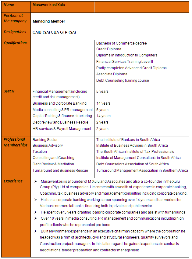 Hereunder is a list of the key individuals that are charged with the day to day operations and running of the business who will be doing the forward planning for all the projects.
